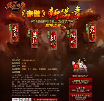 《赤壁 新篇章》是2011年第一个新版本,在以“新篇章”为主题的活动中,玩家也可以对全年更新计划作出展望。在该活动中,一共有5个新篇章道具奖励,玩家在3月14日-4月4日之间,每天可以在长安【顾颖】处领取1个福运通宝,可以获得竞技、英雄、天下、倾城4个新篇章中的一个;而完成每天的英雄玄石任务,则可得到战场的新篇章,集齐这5个篇章就能在【顾颖】处领取大量经验奖励哦。