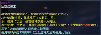 “炼制魂印丹”的任务每人每天只能领取一次,你包包中的战魂魄随着任务的逐渐推进而成长。累计使用5次魂印丹,可以将“战魂魄”升级为“战魂魄(初阶)”,累计使用10次可以得到“战魂魄(中阶)”,当你连续使用15天魂印丹时,就可以得到最终的“战魂魄(高阶)”,将其交给【九天玄女】能得到“战魂使”的称号,继而通过日常任务获取自己的战魂。另外,战魂魄是可以增加玩家属性的,每次升级属性都有提升,最后的“战魂使”称号可以令玩家永久提升50点生命和5点攻击。