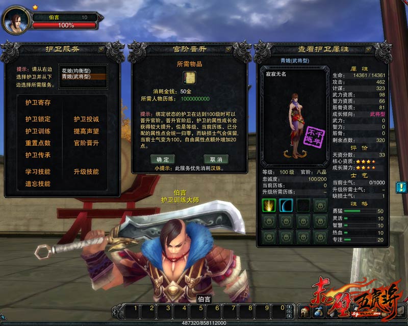 护卫晋升七品后,属性将得到大幅提升,而且比升八品时增加的属性整体增强30%,也就意味着在护卫护佑状态下,玩家将能得到更多的属性加成。七品护卫还可以学到更多的强力技能,战斗辅助效果将增强50%,绝对是玩家野外打怪的得力助手。并且,升官后的护卫外观更加华丽拉风,全新的服装款式和色彩搭配将给大家带来更好的视觉享受。