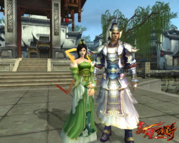 这不是小乔吗?错了,站在这位帅哥旁边的美女可是护卫彩依哦。《赤壁·五虎将》经常在特殊的节日会带给玩家一些特殊护卫,比如彩依、月华兔等等,图中的美女就是彩依七品外观哦,真是楚楚动人啊,可以媲美三国美女小乔了呢!