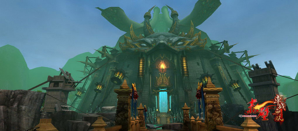 从孟获大本营门口的特写的阶梯来看,如果是等比玩家站在门口,哪怕是仰断了脖子也不可能看全吧。它就像一个巨型的堡垒一样耸立在南疆,是整个南疆人民的信仰。同时该宫殿也是目前《赤壁》中唯一的可进入式场景,从整个环绕视角看,一个空旷的内部空间中,奢华的设计和一个独特的王座,象征着在这里你将挑战蛮疆最后的猛士。